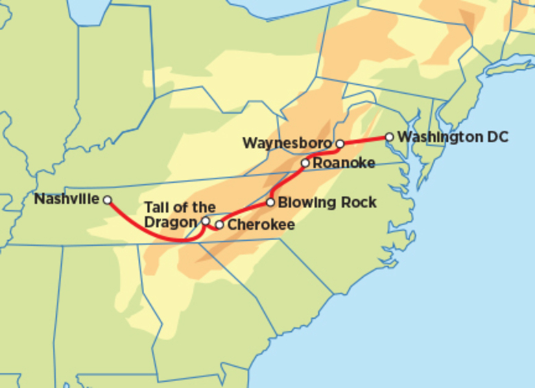 Imagine five days of riding along one of the most beautiful mountain roads ever built! Winding through the Appalachian Mountains, you begin your journey on the 470-mile Blue Ridge Parkway – a dream of twists and turns, colors and vistas where billboards and commercial traffic are both banned. Four days of this amazing riding will just get you set up for the notorious Tail of the Dragon – 318 turns in only 11 miles – before ending your ride in the Country Music capital of Nashville, Tennessee!